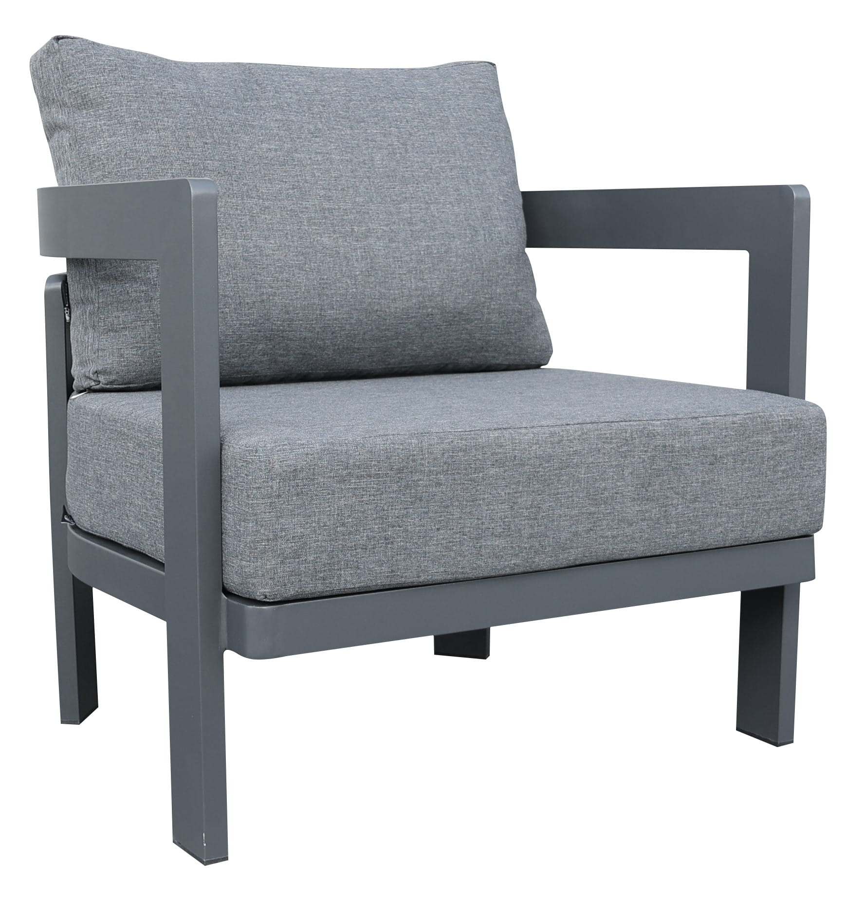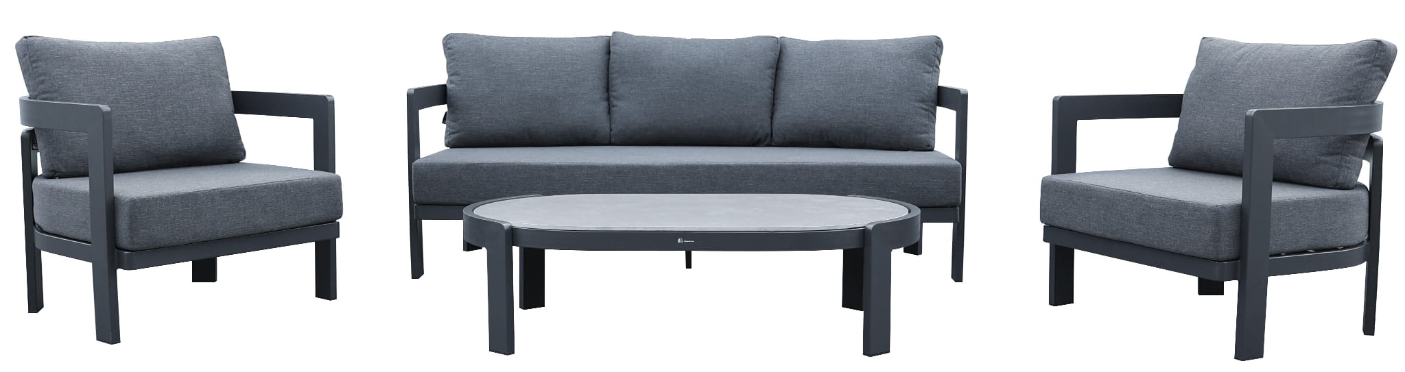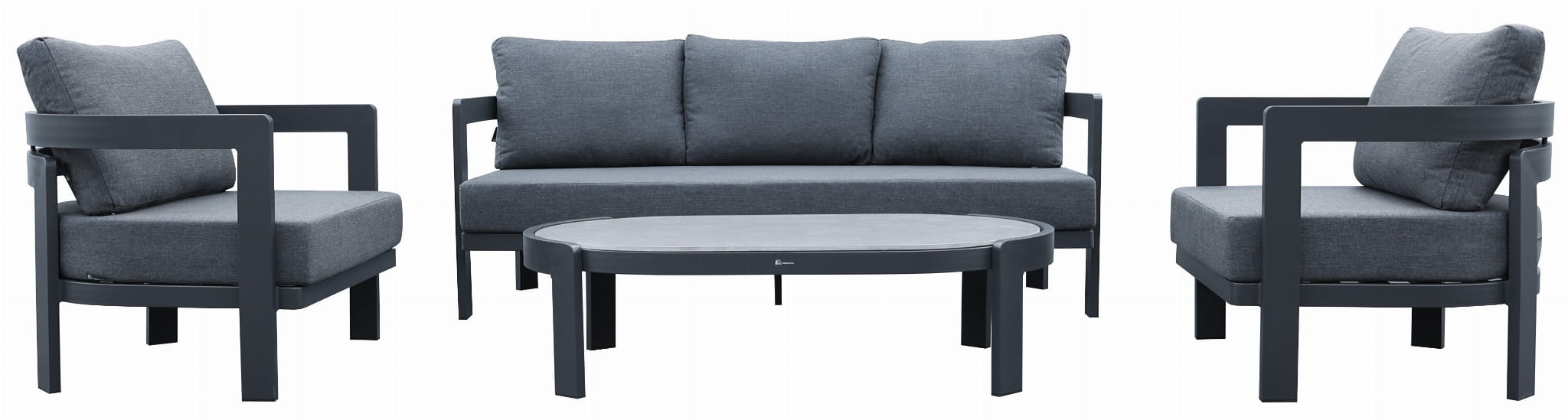 Solidna, aluminiowa grafitowa rama o delikatnie zaokrąglonych kształtach nadaje lekkości i nowoczesnego wyglądu. Miękkie poduszki w grafitowym kolorze z wysokiej jakości materiału poliestrowego są odporne na blaknięcie i nie wchłaniają wody, zapewniając komfort użytkowania na długi czas.
